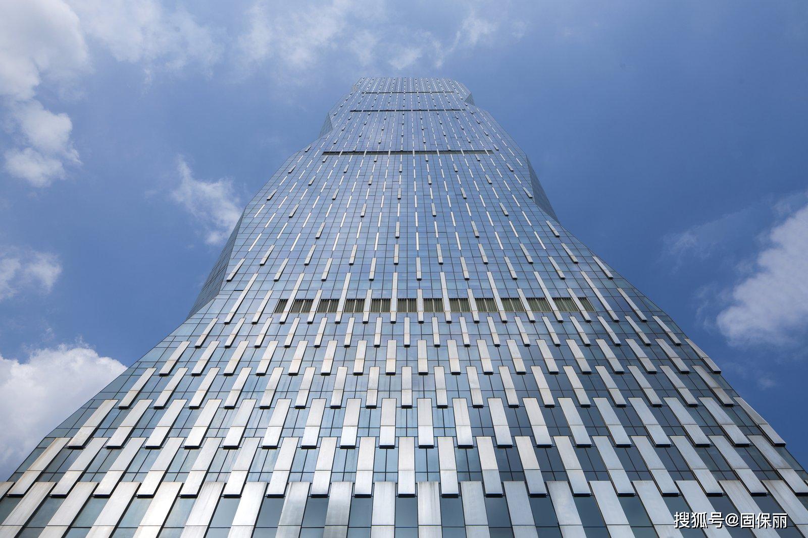 大厦外墙面通过不锈钢复合板和玻璃完美结合,塑造了极富视觉冲击的艺术建筑。不锈钢复合板与幕墙玻璃形成有梯度的嵌入,建筑师说这个作品体现了塔的万有引力,也是对大楼堆叠计划的回应。通过在塔基上使用不透明面板,使得建筑物外壳与桥梁和隧道的基础设施相连接,并开设地铁商铺。在办公楼和酒店的楼层部分,使用的是透明的视图玻璃而不是面板。